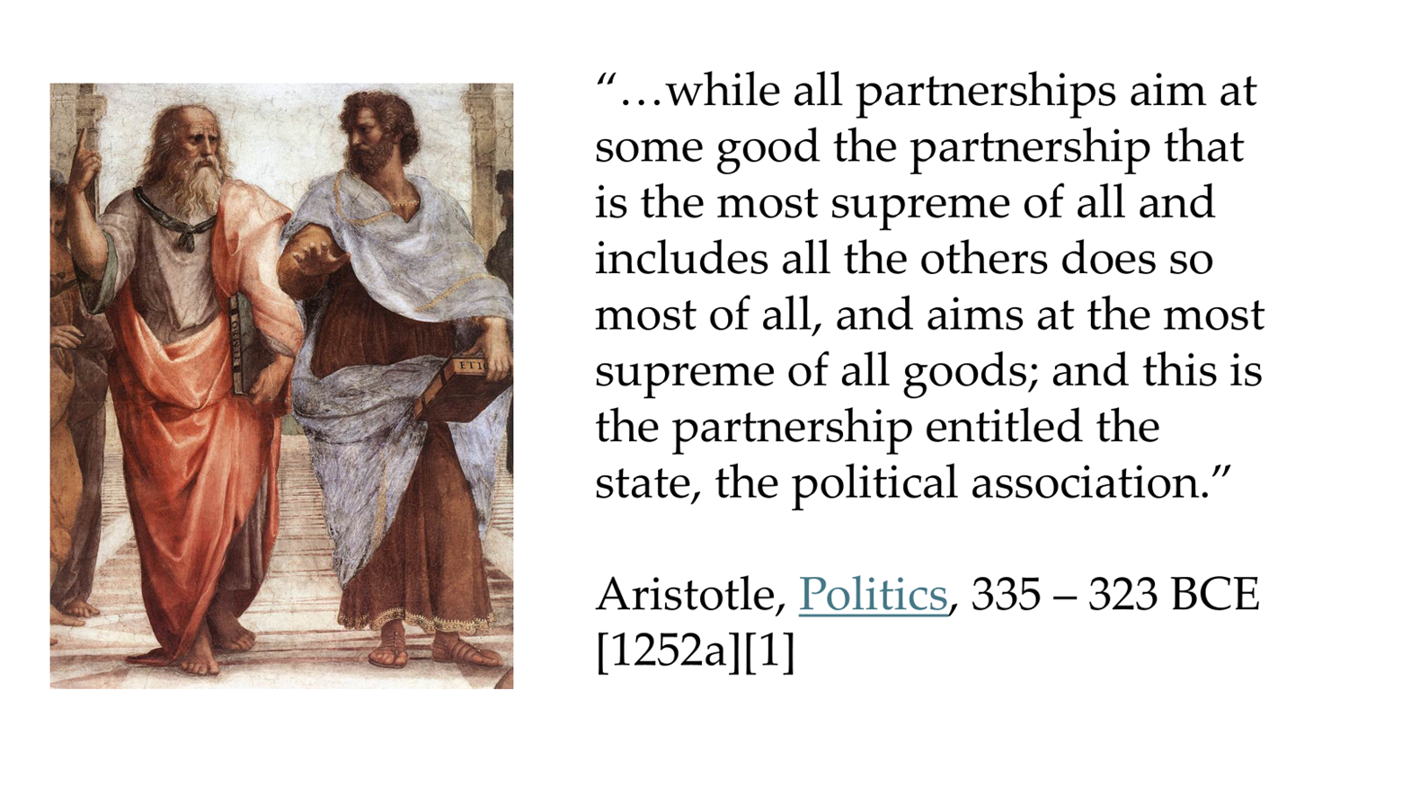Aristotle famously argued that “Man is by nature a political animal.” For Aristotle, whose insights on rhetoric and politics still resonate, everything has a purpose and should strive for perfection in that purpose. A knife is meant for cutting, therefore a good knife should cut well. The purpose of people is achieving eudaimonia, which is often translated as “happiness” but is probably closer to "flourishing." Being fully human, achieving eudaimonia, requires being in community. As he said in the Politics,